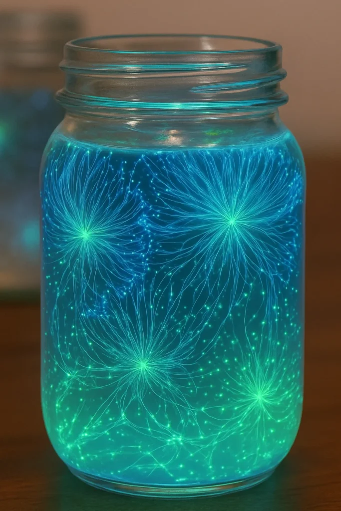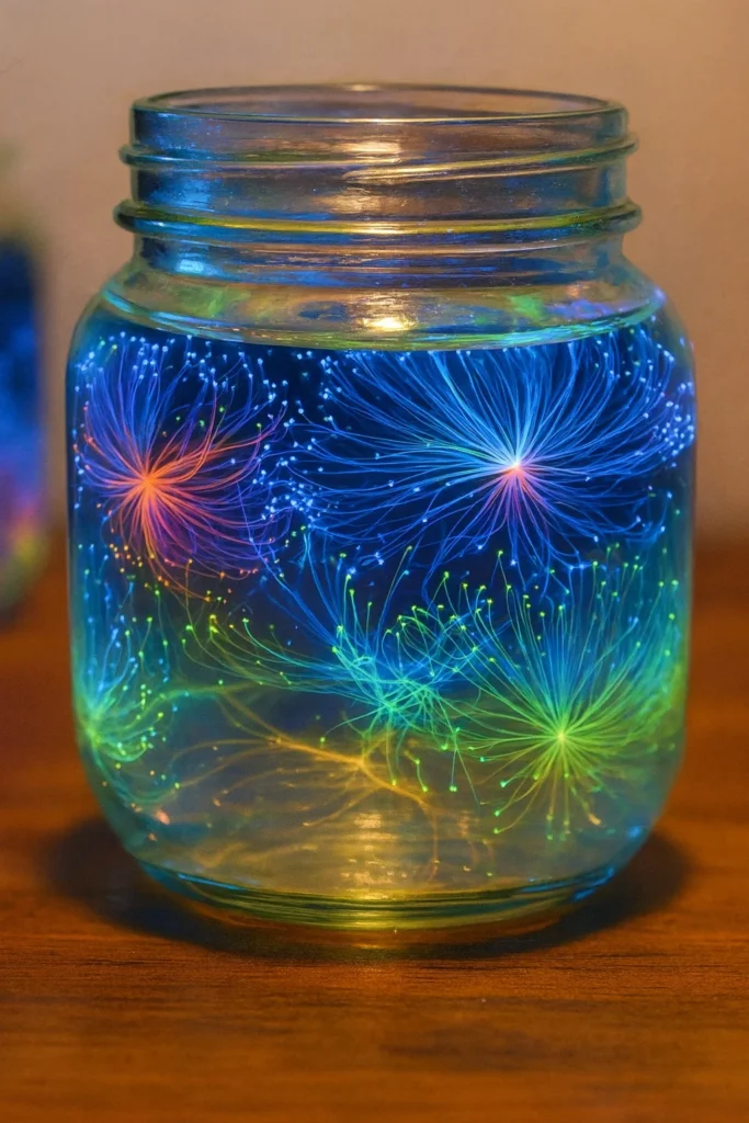 Turn off the lights and break out your UV flashlight. Shine it directly into the jar and boom—everything lights up like you’ve summoned the Northern Lights in your kitchen. This step is what takes it from “cute DIY” to jaw-dropping glow in the dark activity.