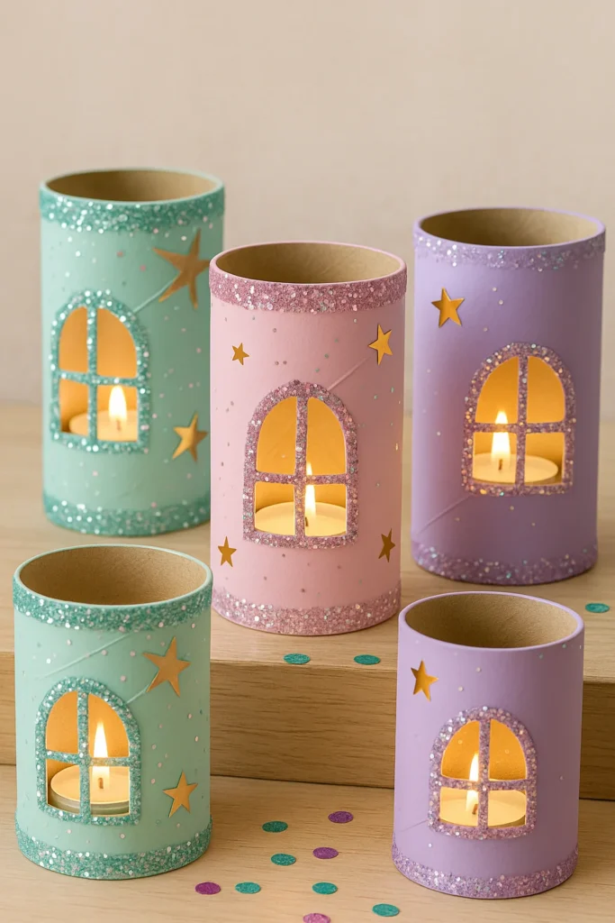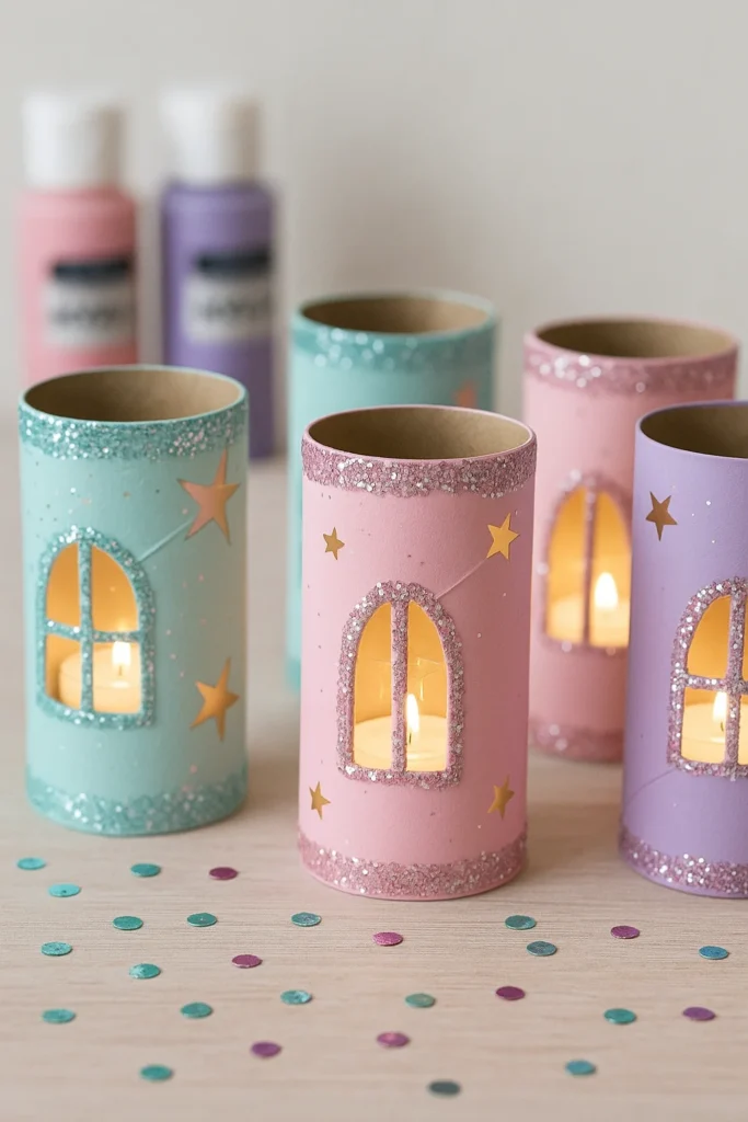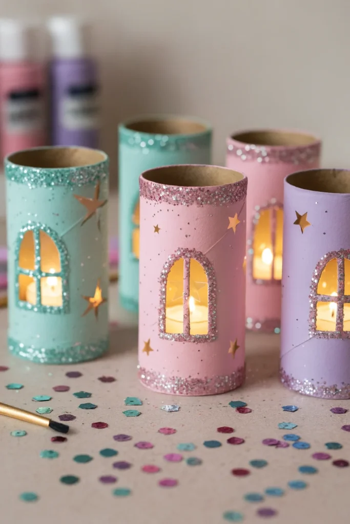 First thing’s first—get those toilet paper rolls looking dreamy. We used pastel acrylics: mint green, lavender, and a blush pink. If you’ve got colored paper, that works too. Just wrap and glue. Let them dry fully—I’ve learned the hard way that glitter won’t stick to half-dry paint.