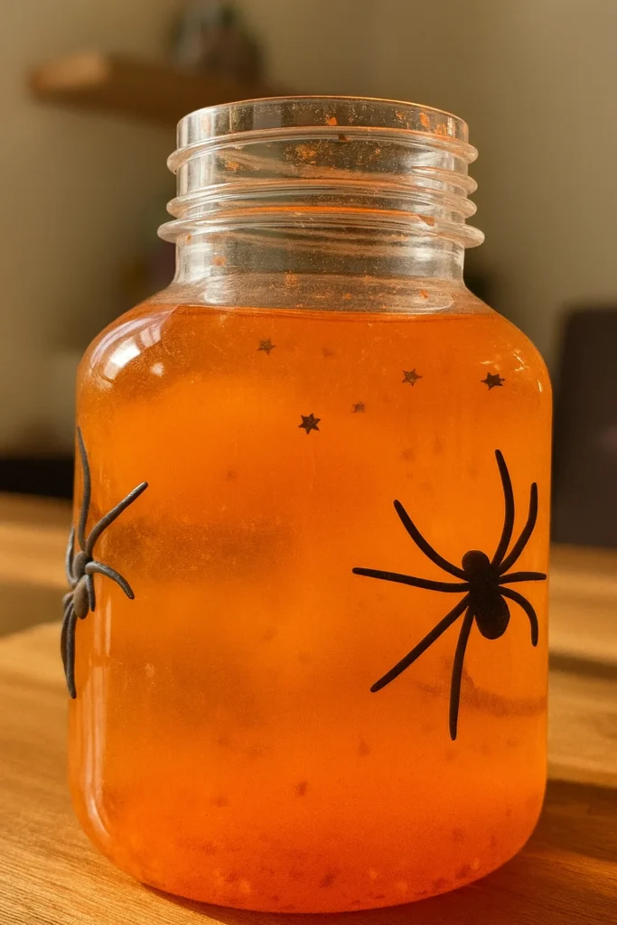 Here’s the fun part. Add your glitter, sequins, or tiny Halloween trinkets. I always drop in a few mini plastic spiders for extra creep factor. This is what makes your haunted lava lamp actually look haunted.