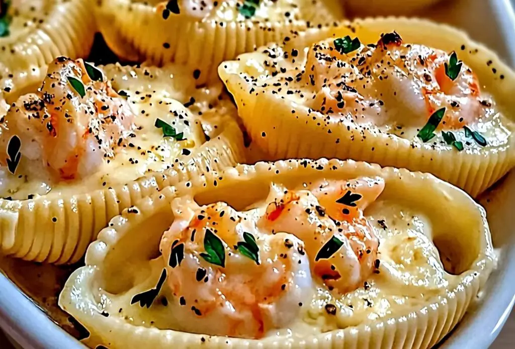 3. **Stuff Shells:** Generously fill each cooked pasta shell with the seafood mixture. Arrange the filled shells snugly, open-side up, in the prepared baking dish.