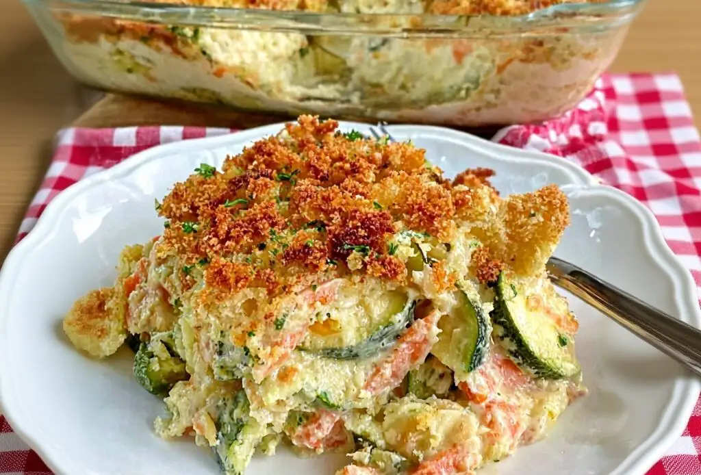 A warm, comforting, and incredibly flavorful bake featuring tender zucchini and carrots, a creamy cheese filling, and a crispy, buttery stuffing topping.