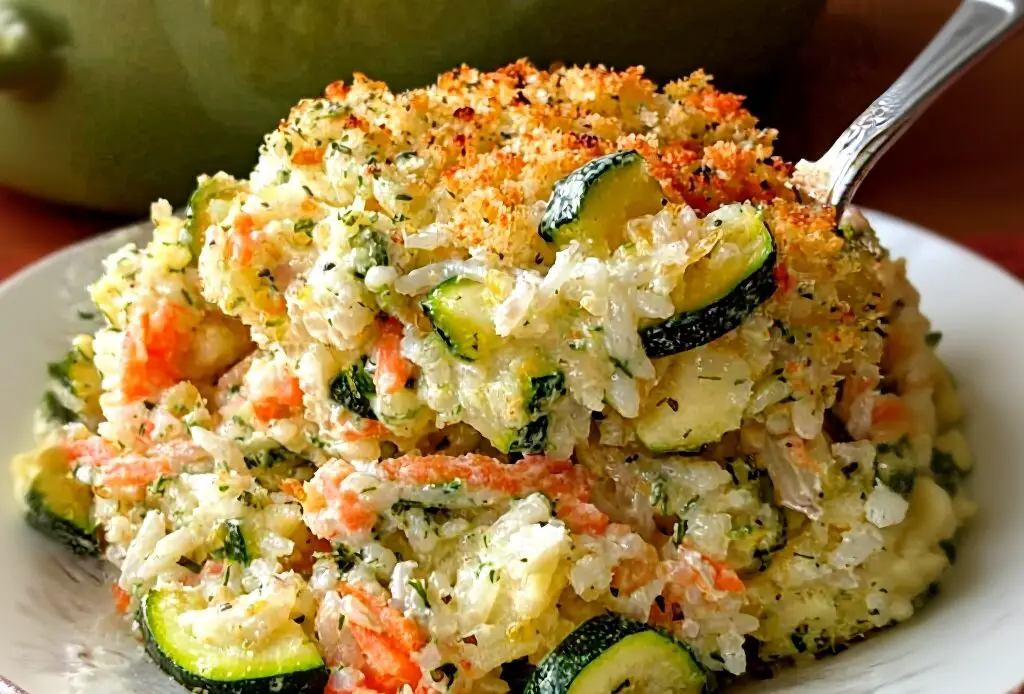 A beloved and comforting dish combining fresh zucchini, rice, and a creamy cheese sauce, all topped with a crispy stuffing mix. Perfect for using garden zucchini!